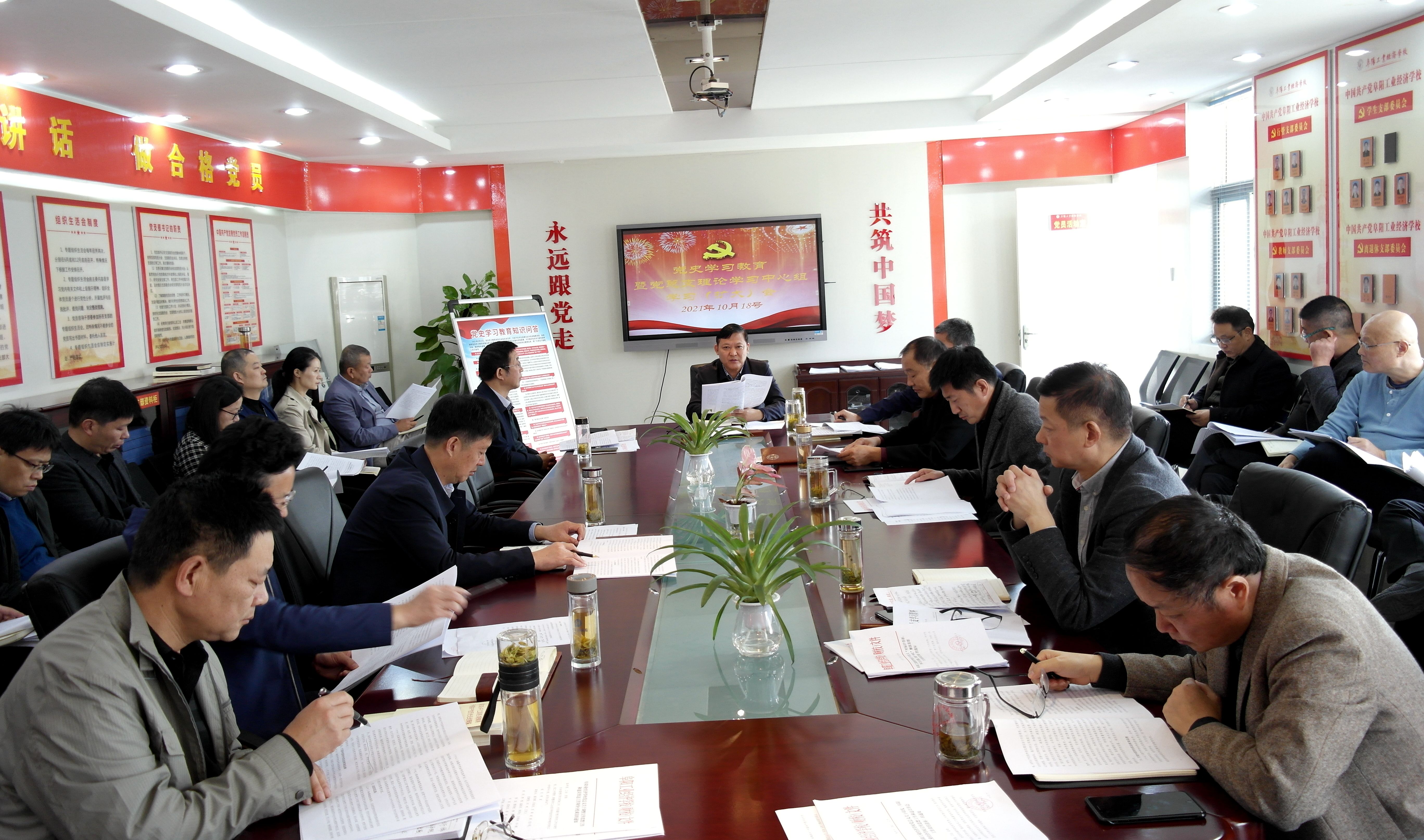 10月18日,阜阳工业经济学校召开党史学习教育专题学习会暨党总支理论学习中心组学习(扩大)会。校班子成员、各科室负责人参加会议。会议由校党委书记、校长周波主持。