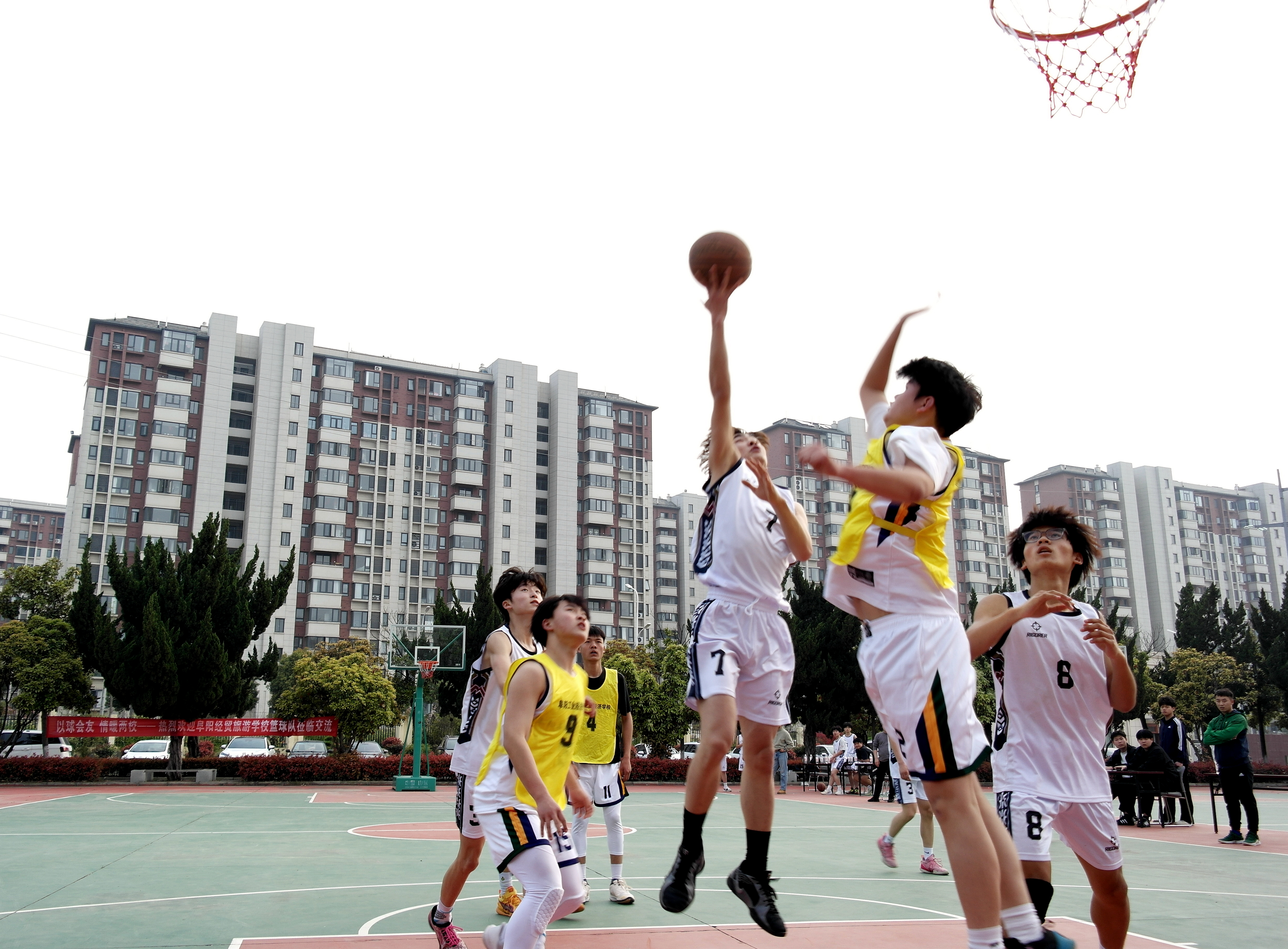 为深化校际体育交流,丰富校园文化生活,锤炼学子体育素养,3月31日,阜阳经贸旅游学校篮球队一行莅临我校,开展主题为“以球会友 情暖两校”的篮球交流赛。我校相关负责人、体育组教师,以及两校篮球队队员、部分学生代表参加活动,共同见证这场充满激情与温情的体育赛事。