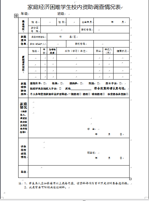 家庭经济困难学生校内资助调查情况表