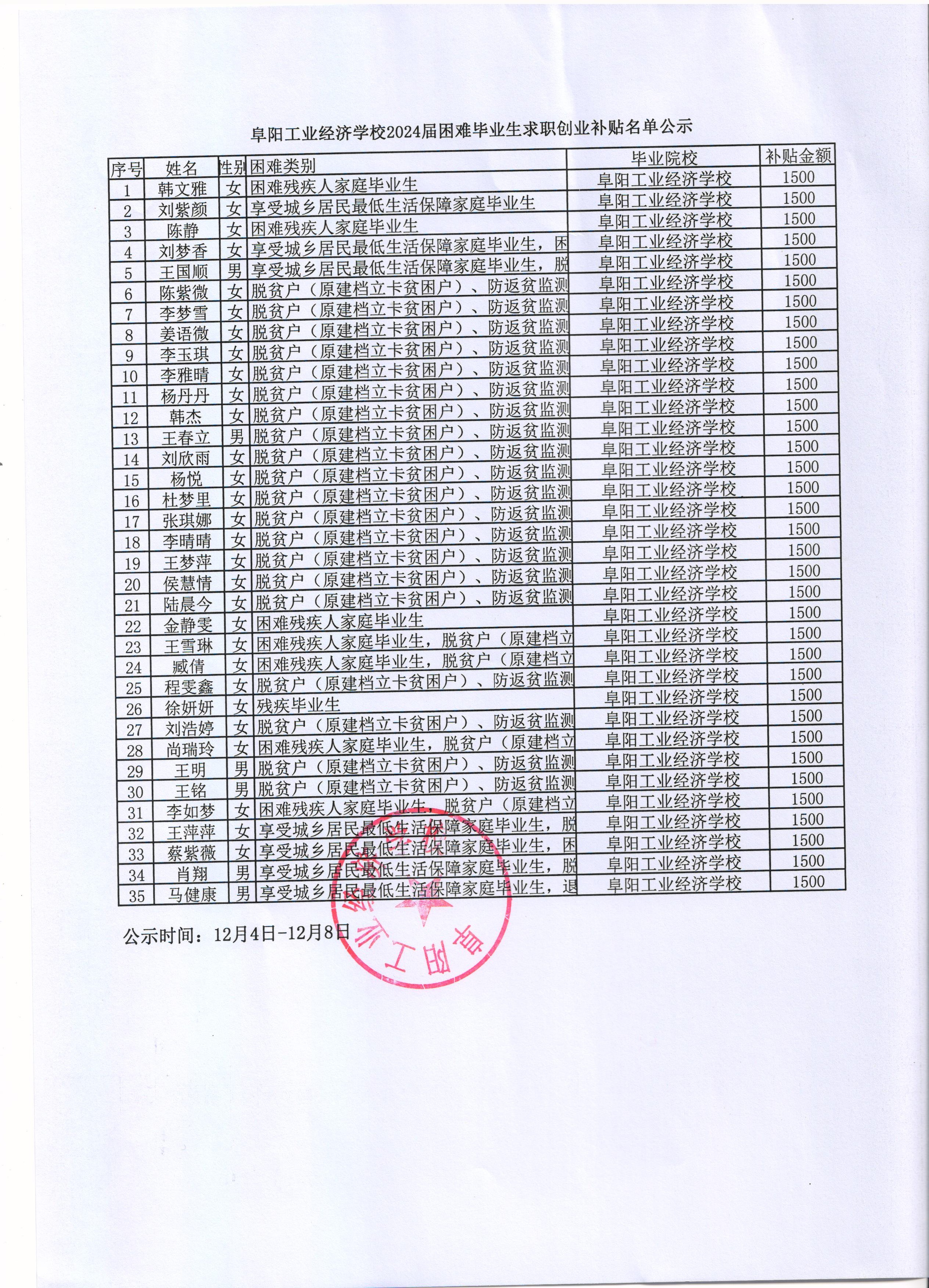 阜阳工业经济学校2024届困难毕业生求职创业补贴名单公示
