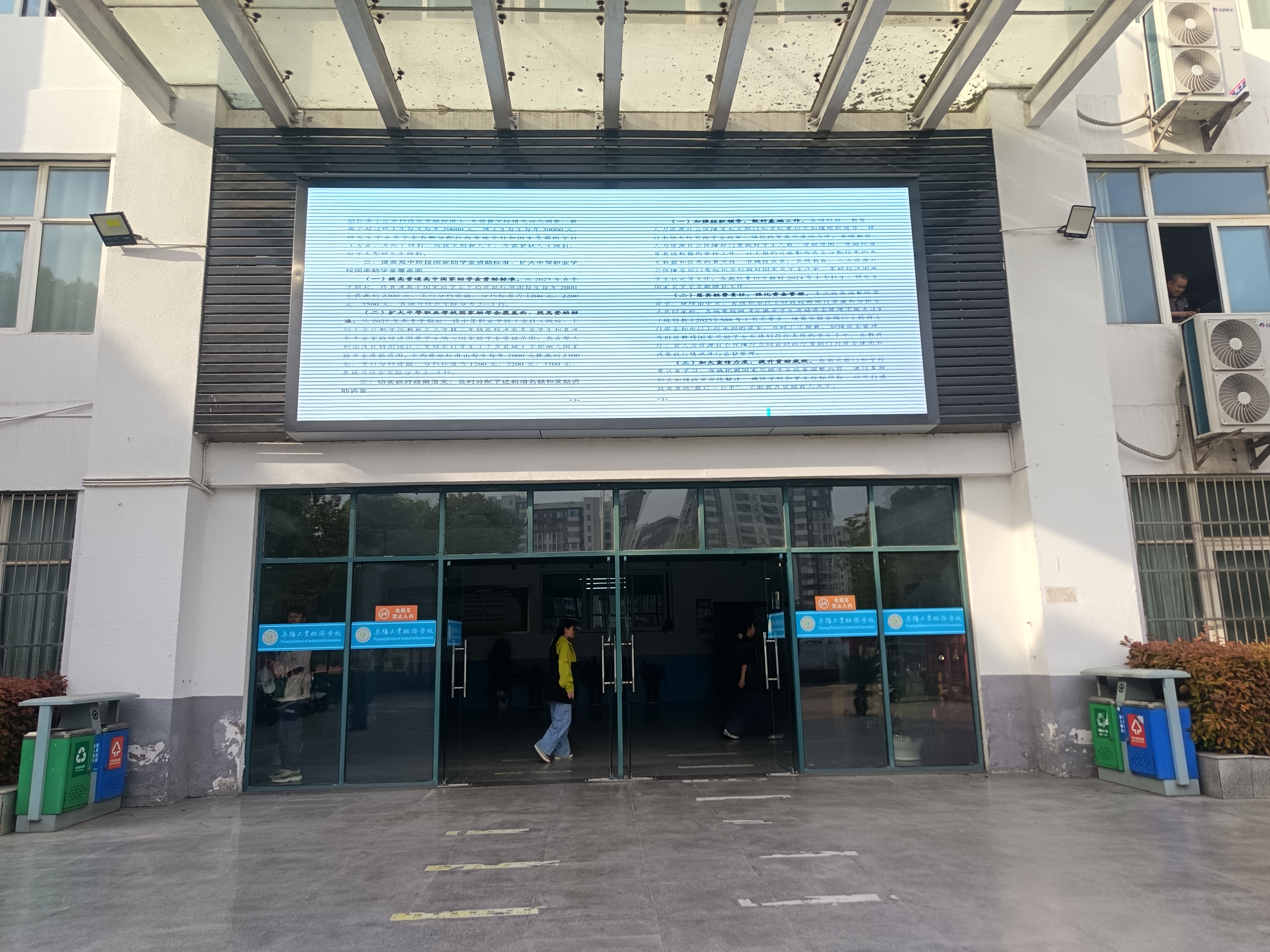 阜阳工业经济学校利用校园电子屏宣传《关于调整高等教育阶段和高中阶段国家奖助学金政策的通知》